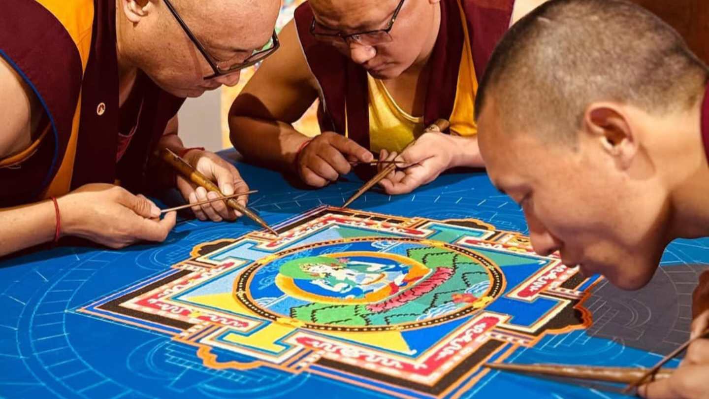 El lugar vibraba con una energía difícil de describir. No era ruido. Era una suerte de silencio cargado. Había incienso, sí. También música lejana, compuesta por cuencos, mantras, soplos. Pero lo que más impresionaba era la precisión. Los monjes tibetanos —serenos, pacientes, casi inmóviles— vertían arena coloreada desde instrumentos metálicos que resonaban como llaves abriendo puertas invisibles.